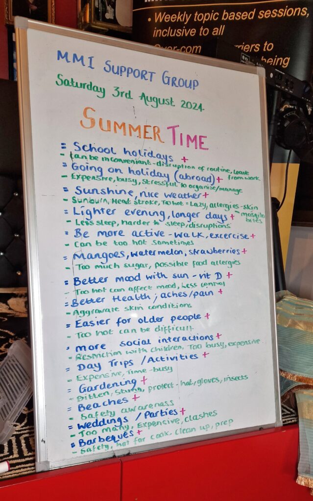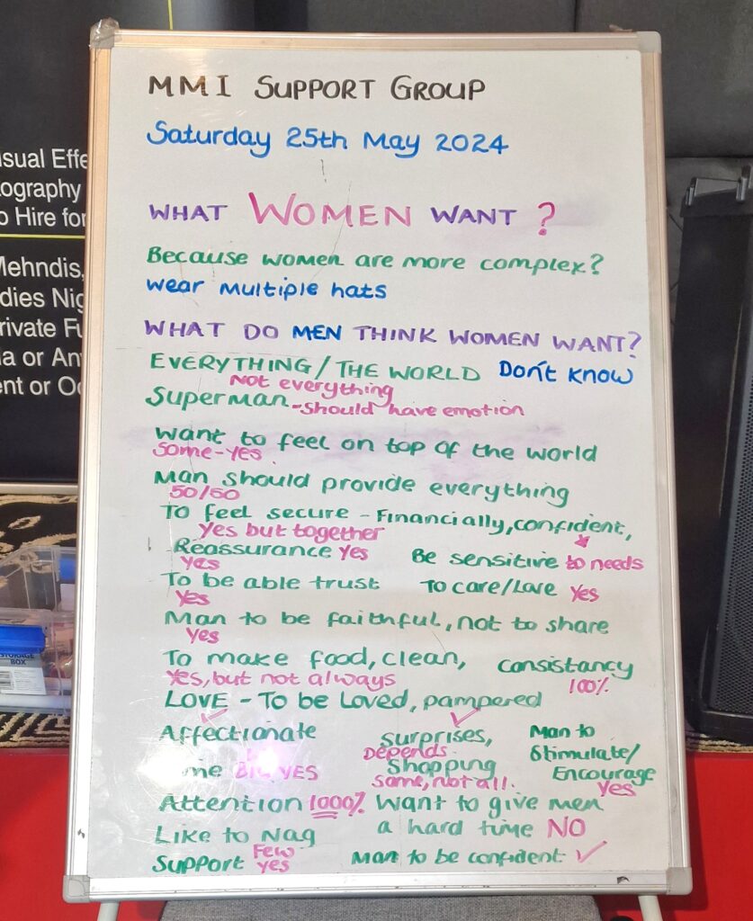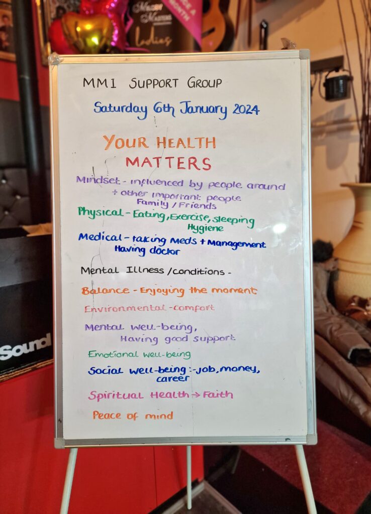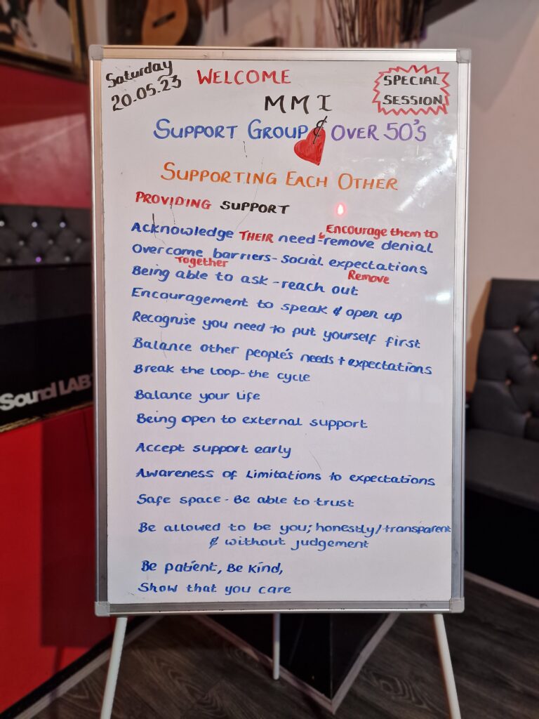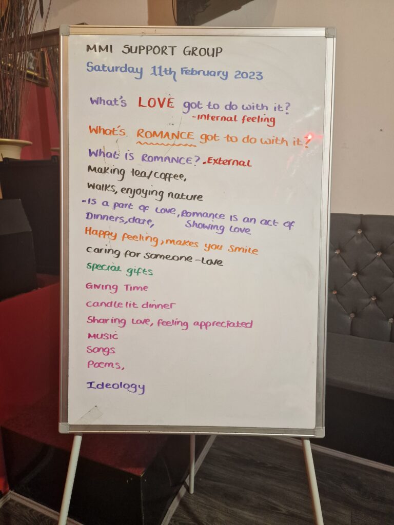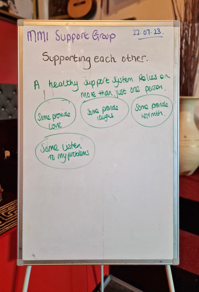 True to MMI values, we provide a homely environment and a safe space. A weekly topic is planned according to the needs and wishes of the group but always allows for people to share their views and concerns. We offer a self-expression platform which aims to boost self-esteem and increase confidence. There are also fun activities to encourage real human interaction.